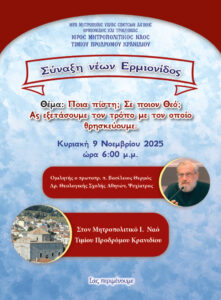 Με επιτυχία πραγματοποιήθηκε η πρώτη συνάντηση νέων Ερμιονίδος για την φετινή περίοδο. Ομιλητής ήταν ο πρωτοπρ. πατήρ Βασίλειος Θερμός, διακεκριμένος ψυχίατρος, διδάκτωρ θεολογίας και καθηγητής της ανωτέρας Ακαδημίας Αθηνών. Το θέμα της ομιλίας ήταν: « Ας εξετάσουμε τον τρόπο με τον οποίο θρησκεύουμε».