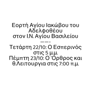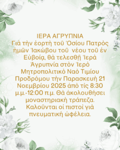 Μὲ τὴν χάρη τοῦ Θεοῦ τελέσαμε τὴν 21η πρὸς 22α Νοεμβρίου 2025 τὴν καθιερωμένη ἱερὰ Ἀγρυπνία τιμῶντας τὴν Μνήμη τοῦ Ὁσίου καὶ Θεοφόρους Πατρὸς ἡμῶν Ἰακώβου τοῦ Νέου του ἐν Εὐβοίᾳ. Μετὰ τὸ πέρας τῆς ἀγρύπνιας ἀκολούθησε μοναστηριακὴ τράπεζα στὴν αἴθουσα τοῦ Ναοῦ. Τὸ ψαλτήριο καὶ τὸ ἱερὸ βῆμα διακόνησαν οἱ Ἀναγνῶστες Κωνσταντῖνος Βλαχόπουλος καὶ Δημήτριος Μπουγιατιώτης, ὁ Ραφαὴλ Βλαχόπουλος καὶ ὁ Ἀνάργυρος Ἀθανασούλας. Τὸ γεῦμα ἑτοίμασε καὶ προσέφερε εἰς μνήμη τῶν προσφιλῶν του ὁ ἐκκλησιαστικός μας ἐπίτροπος κ. Μιχαὴλ Μανιάτης βοηθούμενος ἀπὸ τὶς δραστήριες κυρίες τοῦ ἐνοριακοῦ μας φιλόπτωχου καὶ κυρίες τῆς ἐνορίας μας.