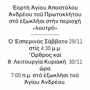 17. Κυριακή 30 Νοεμβρίου 7-9:45 πρωί θ. Λειτουργία Ι. Ν. Αγίου Ανδρέου στο «λουτρό»
