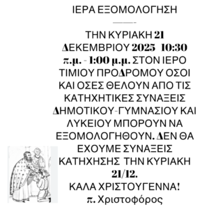 •Κυριακὴ 21/12 πρὼὶ στὶς 7:00 Ὄρθρος καὶ θ. Λειτουργία.