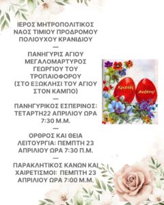 Κατηχητικές Συνάξεις όλων των βαθμίδων μαζί με Πασχαλινό καλλιτεχνικό εργαστήρι στις 11:00 π.μ. στην αίθουσα του Ι. Ναού με την εικαστικό κ. Αγγελική Μπουγιατιώτη – Μανιάτη.