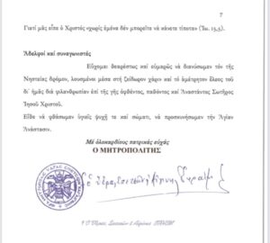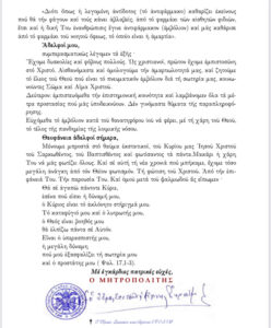 Ἀπευθυνόμαστε πρός ἐσᾶς γιά νά σᾶς δώσουμε καί δι᾿ αὐτοῦ τοῦ τρόπου τήν πατρική μας εὐλογία, ἀλλά καί γιά νά σᾶς ἐνημερώσουμε ὑπεύθυνα γιά τίς ἀποφάσεις πού ἐλάβαμε αὐτές τίς ἡμέρες.