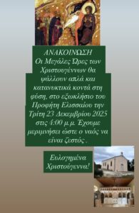 • Τρίτη 23/12 Οἱ Μεγάλες Ὧρες τῶν Χριστουγέννων στὶς 4.00 μ.μ. στὸ ἐξωκλήσιον τοῦ Προφήτου Ἐλισσαίου.